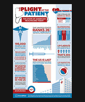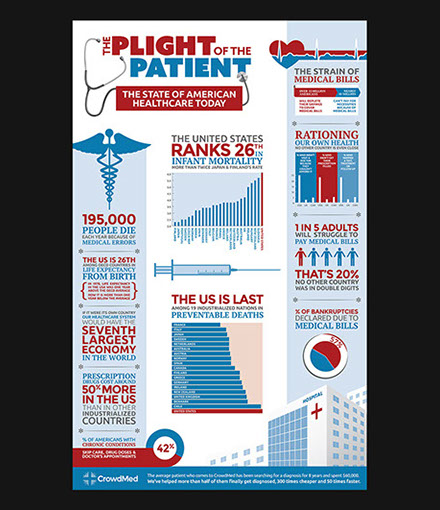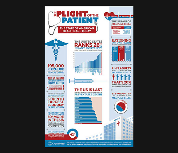 A medical crowd-sourcing site to help undiagnosed patients, CrowdMed needed to inform the public of the plight of the average patient with rare conditions, and of the site's ability to use an unharnessed resource to help them. The goal was to create an easily digestible way for viewers to absorb these startling statistics. The two infographics shown were distributed on their website and various blogs.